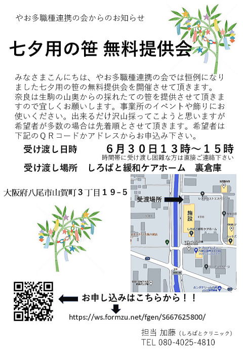 2025年6月20日㈮ やお多職種連携の会ボウリング大会開催されました ![]() 今回も多くの方々にご参加していただきました。 皆様のご協力もあって無事に大会を終えることができました 上級者の華麗な投球からのストライクについ見とれてしまいました。 とても楽しい時間になり本当にありがとうございました。 また次回もお会いしましょう。 ![]() ![]() ![]() ![]() 大会風景youtubeより前回のボウリング大会の結果報告 今回、事業所同士交流を深めて頂く機会としてボウリング大会を令和6年6月21日に開催させて頂き。多くの参加者のなか無事終えることが出来ました。 今回都合が悪くご参加頂けなかった方も多くいらっしゃいました、次回の開催を楽しみにお願いします!! ![]() ![]() ![]() ![]() 大会風景youtubuより令和7年7月七夕祭り用笹の無料提供会のご報告 昨年に引き続き七夕祭り用の笹の提供会を6/30に行いました。 大変多くの事業所の方々にお越しくださいました 皆様に喜んで頂けて本当によかったです。 七夕当日までは霧吹きで笹全体に水を毎日してあげてくださいね ![]() ![]() ![]() ![]() ![]() 2024年 七夕の笹 無料提供会のご報告。 令和5年6月27日に七夕祭りをされる施設や事業所さんに笹をご提供させて頂きました。八尾市の多くの事業所の方々が取りに来られ、50本すべてお渡しする事が出来ました。大変喜ばれており良かったです。来年もよろしくお願いします。 ![]() やお多職種連携の会のFBあります。マークをクリックして宜しければフォローお願いします。 ※コロナ禍でしばらく活動出来ていませんでした。これからも宜しくお願いします。 ![]() やお多職種連携の会ではLINEで情報を配信しております。宜しければQRコードから登録お願いします。 ※LINEアカウント登録は企業でないと作成困難なためしろばとクリニックの名前で登録されています。 |